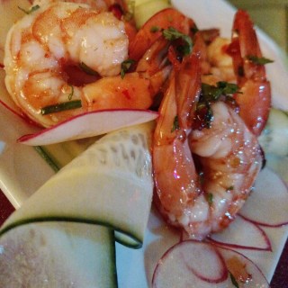 A small plate of shrimp quickly arrived, on a bed of vegetables that had visited a mandolin and covered in a light rice-wine glaze. I could eat this all night.