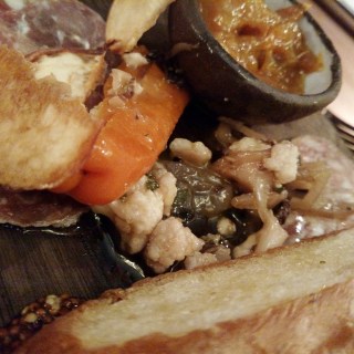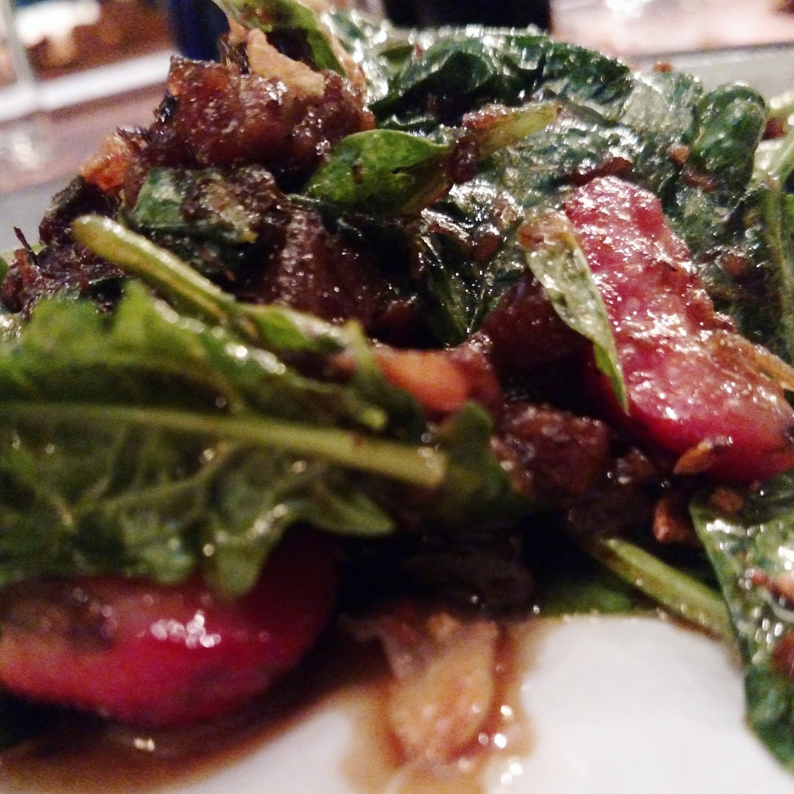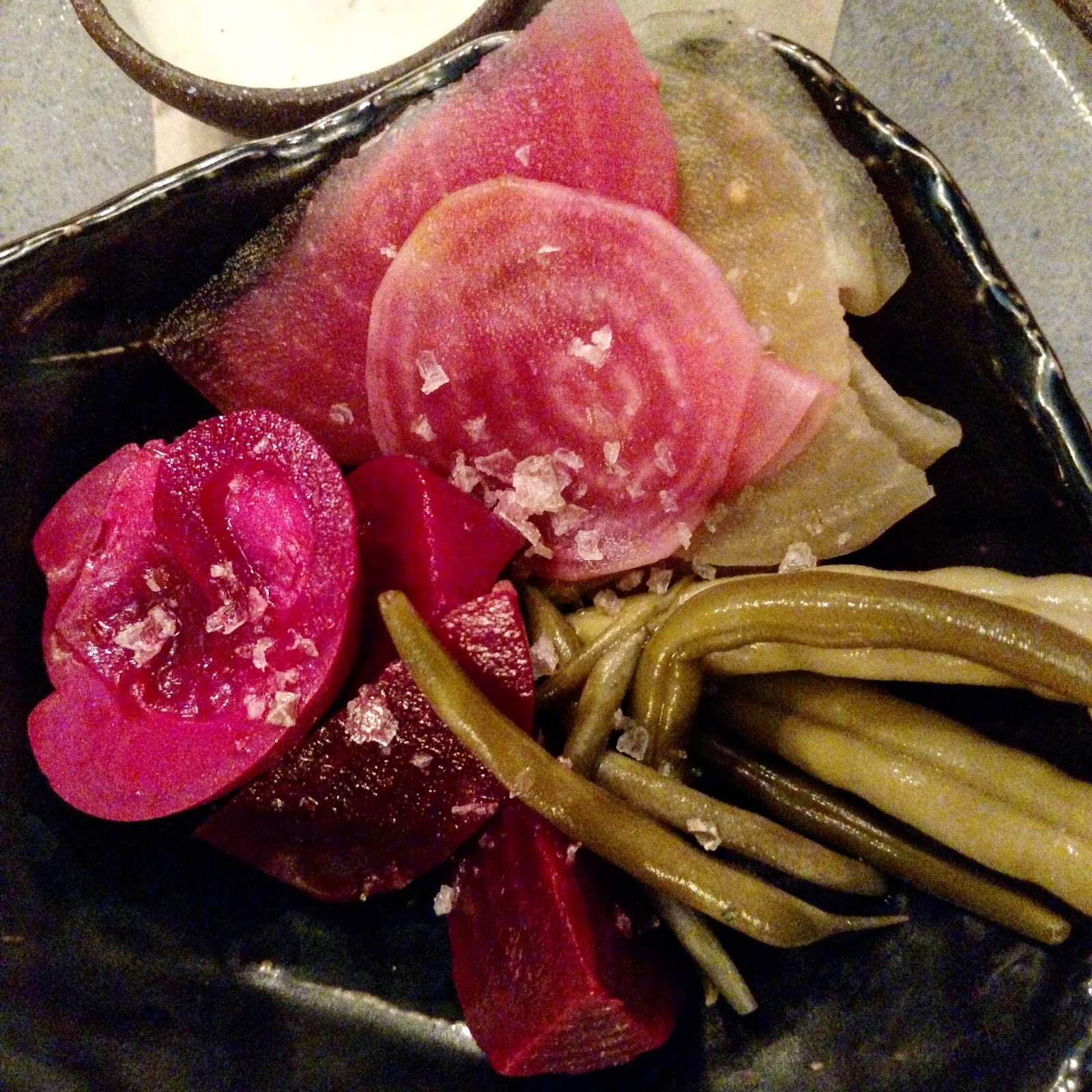 Moving in to food, instantly was drawn to a wilted-spinach salad with pork belly. Perfectly glazed–greens AND toppings. I know I have gone on record lately complaining that *pork belly* needs to be over already, but these little caramelized nuggets made me do a bit of retracting on that theory. Probably my favorite dish of the evening. And PICKLES!!! So many house-pickles popping up on menus now. I am SO HAPPY for this trend. And, in addition to a brilliant mound of pickled cauliflower and peppers buried like treasure in the depths of the charcuterie plate, there was a stand-alone pickle selection on the starter menu!! So many resties with great pickles I have had to ask for a side of their offerings, and here they thought of that. Beets, green beans, daikon–all with shrill different flavors, but acidity in check–nothing to clash with the wine.