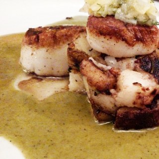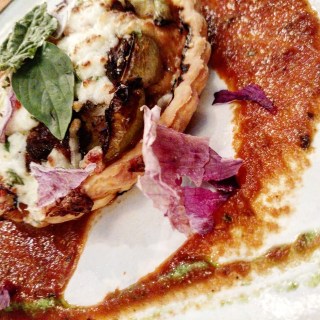 After a “crudo” tower of tuna far closer to a ‘tartare’ description, everyone was praising the scallops–including those at our table–nested on roasted potatoes and swimming in green tomato puree. The vegetarian offering on the list jumped out at me. Tired of your choices being limited to fettuccine Alfredo or stir-fry? Help is here. The vegetable tart had pluses and minuses going on in it, but definitely out-of-the-ordinary for non-meat-eaters. Rarely do you see a creative, labor-intensive dish exclusively for vegetarians on an other-wise meat-driven menu, but Blue Heron’s little pie in a puddle of spicy marinara is just that. A few tweaks here and there and this will be the talk of the healthier-than-thou community.