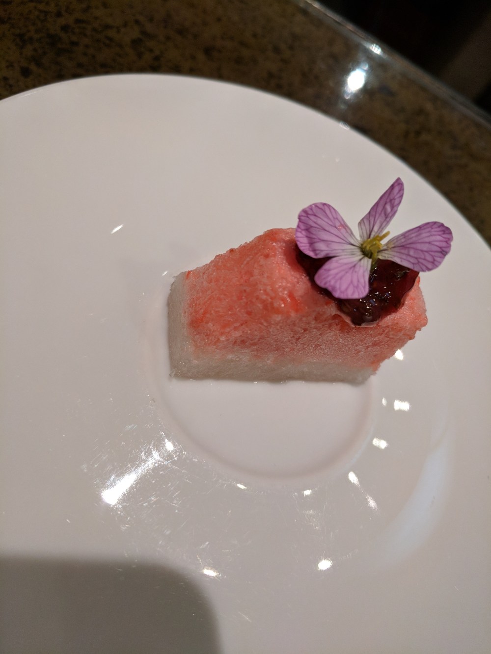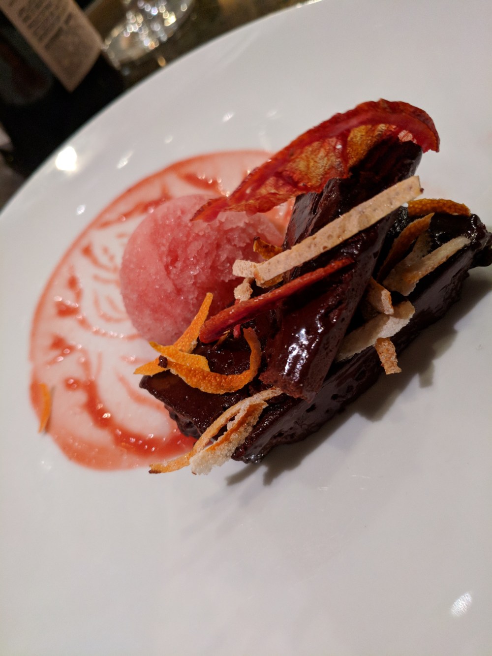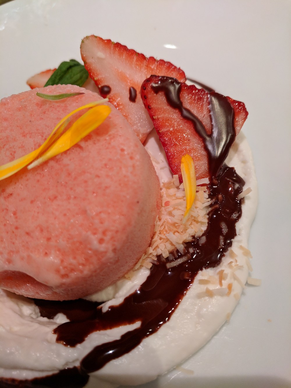 Oh, is it time to talk about dessert already? But I just want another order of fish! That’s not ice cream–oh no–it’s aerated sherbet in coconut mousse. And the chocolate sauce led to another dessert order: the actual chocolate cake.