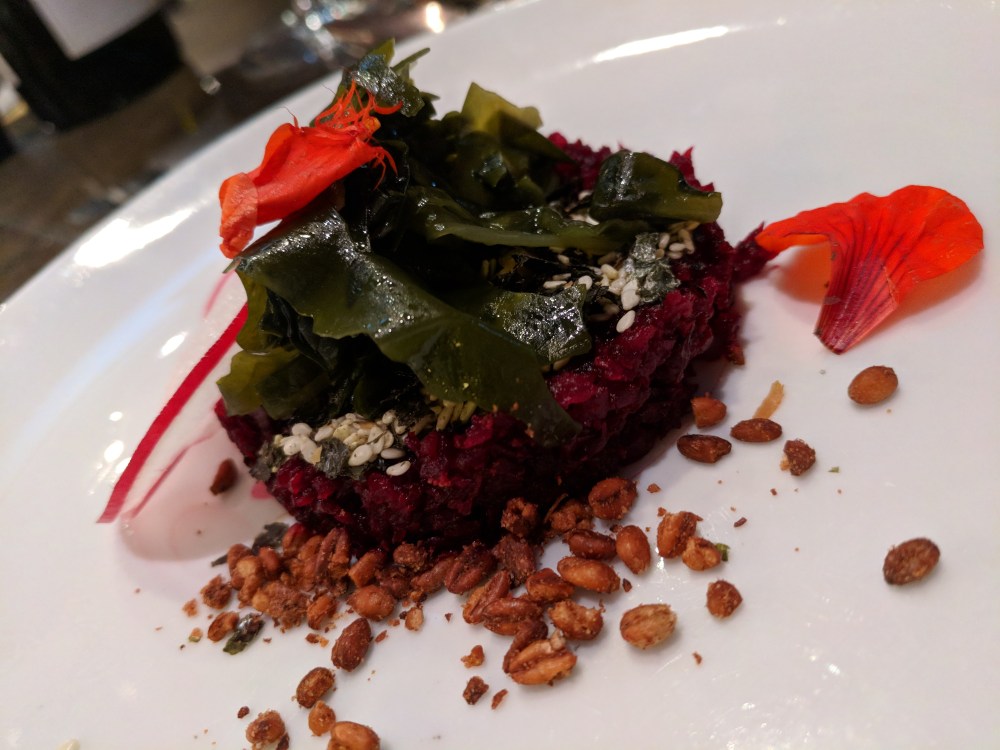 Several vegetarian options appear, beet tartare being the one we were treated with at the grand opening. Yes, that’s only ONE LETTER from the real deal!
