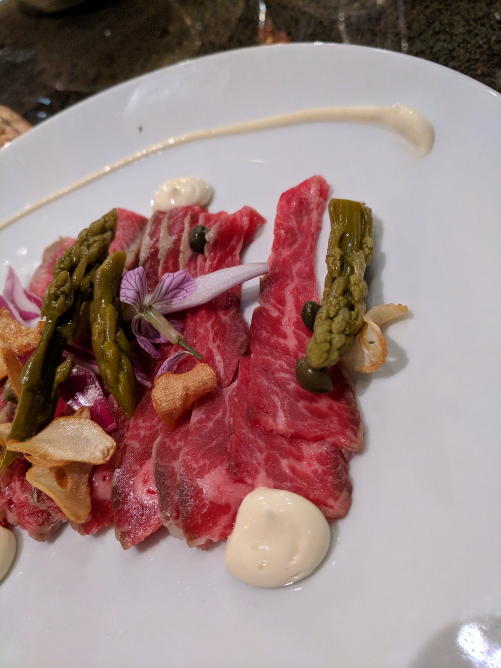 And it’s not even all fish! The Beet Tartare was noted, and quickly following is the quite-unusual Carpaccio. I consider Carpaccio one of the measuring-sticks by which all Italian restaurants are measured. This, however, is NOT your classic filet tartare with olive oil and capers. EVERYTHING has been switched up, from the cut of meat to the aioli, deep fried garlic chips and pickled asparagus. An absolute MUST-ORDER on a list of must-orders.