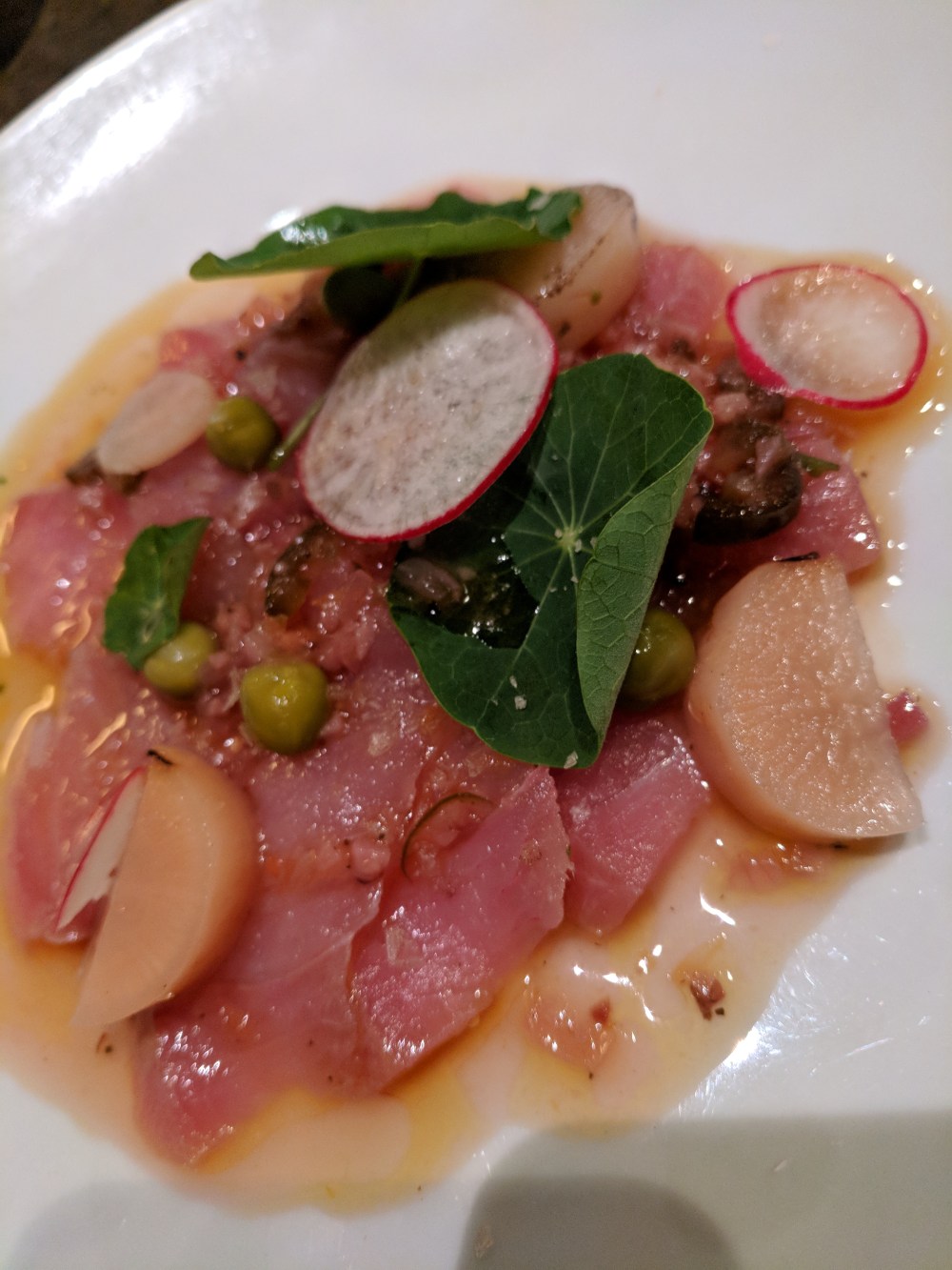 Toridito is a Peruvian-style of ceviche, not seen on too many menus around here and a lively presentation of beautiful fish with vegetables and spicy garnishes. Chef Thomas Drahos creates masterful presentations of this dish with your choice of fish and sauce.