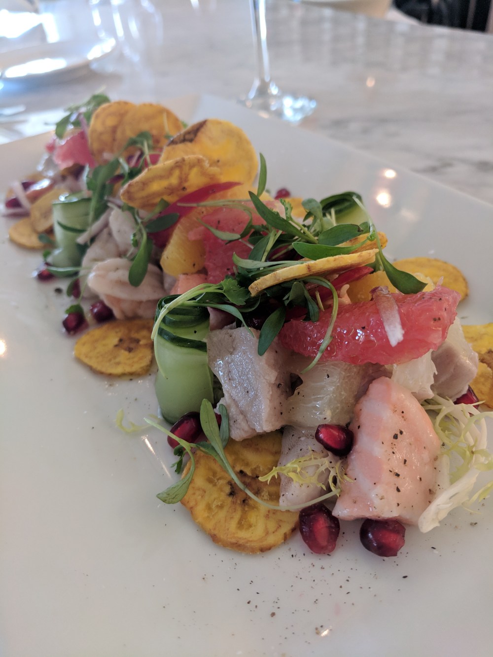 I get into BLUE MOON OVER AVILA about once a month. They still keep fiddling with the menu. The new winelist is pretty impressive–albeit a bit dorky. The old ‘Poisson Tahitian’ or whatever ceviche cocktail dish has been replaced with a GIANT spread of fish, shrimp, and salmon–all prepared ceviche-style, with fat chunks of peeled grapefruit and orange and plantain chips. A gnocchi dish has them coated in something colorful but rather benign like tomato or paprika and fried. Interesting. This restaurant continues to plug along, so much potential but never really wowwing.