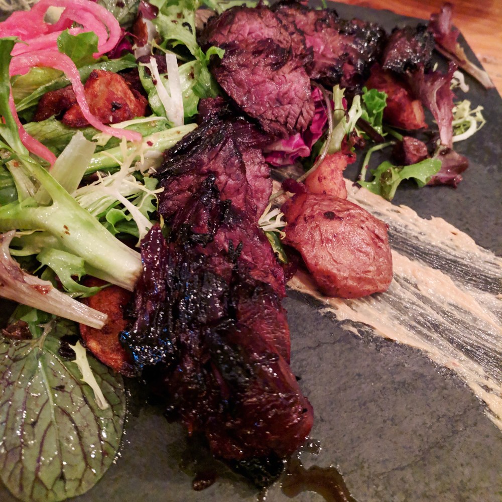 I went to SIDECAR for dinner. Never been there for dinner before. Hundreds of lunches but was downtown for something and a couple options backfired and decided to try Sidecar for a full-on-formal. It’s REALLY nicely done. I have to be honest: I stopped going to Sidecar a year or so ago when they gutted their winelist and went completely canned and tap. And I said some fairly un-nice things about them at the time for this decision. Well, I am happy to announce that whole situation has righted itself, and we are back to a short, concise, very workable bottle-list with everything available BTG. Their interpretation of steak-frites: a hanger and fingerlings is AMAZING, heavily marinated, crusty around the edges, and bedded into perfect greens. A note to done-phobes: This thing is designed to be cooked. I ordered it MR and I could *possibly* see people who still like their beef deep pink taking issue. Might wanna start with ‘Rare’. I thought it was perfect for the cut and presentation.