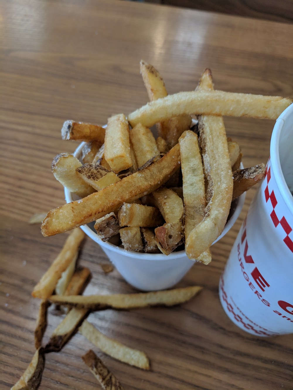 I went to 5 GUYS for the first time. Been really curious, as I love a great burger and everyone raves about it. Easily some of the worst food I have ever experienced. How on earth can they sell such dretch? The fries are EASILY the worst ever constructed in the history of the planet. Even worse than In-N-Out, a feat seemingly impossible. The burger patty was obviously hand-formed–you know: it had that irregularity to it kinda like a outdoor BBQ. Not foot-ball-shaped like your neighbor does, but it had the breakage and cracking and crumblyness around the edges like a back-yard burger. But it was ridiculously bland. I don’t typically salt my burgers, but if it had been available, I would have this one. Otherwise, the burger was this grey, mangled thing, sweaty in its tin-foil and bland. I’m not certain it had onions in it. But it DID have mushrooms. I never need to go back.