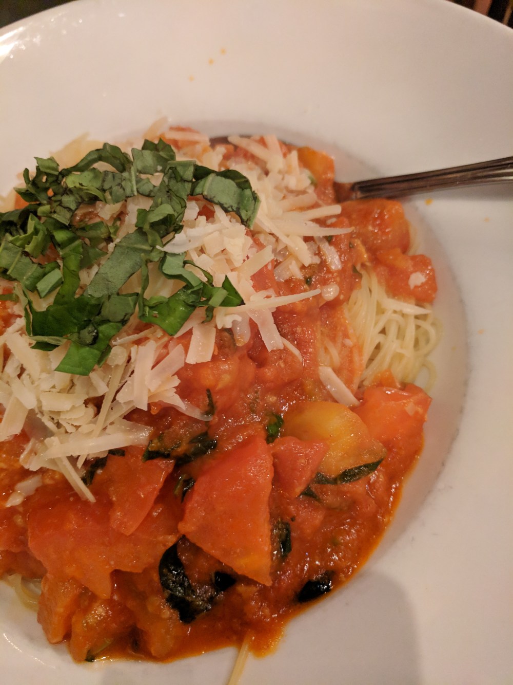Got into UPPER CRUST TRATTORIA for the second time in my life. This place is interesting and quite flies under the radar of most locals I believe. For the second time, I was overwhelmed with the ambiance, the winelist, EXPERT service from mature wait-staff, a deep menu and ridiculously cheap prices. For this visit, I again followed my recent theme of *cheapest Italian wine bottle and lowliest pasta dishes* and was generally pleased. The tomato-basil capellini was near-perfect, although the gnocchi in pomodoro was full of pancetta and had a strong lemon element. It was a bit odd, but otherwise–WOW. Check this place out! Easily the week-day *I don’t feel like cooking* entry about town and Monday nights all bottles are half off?!?!? There are some SERIOUS bargains on that list.