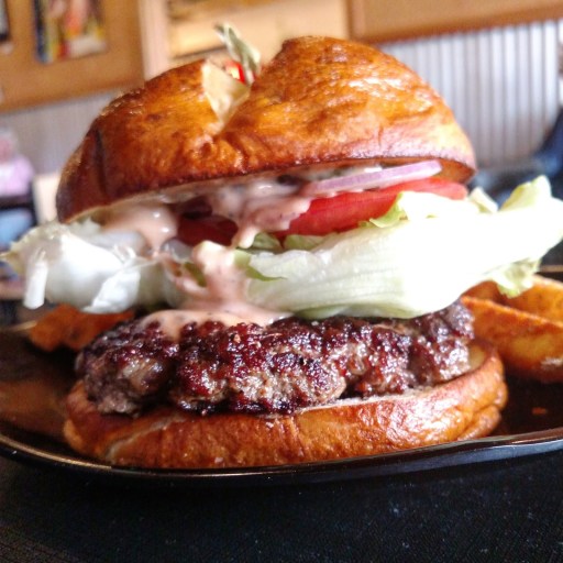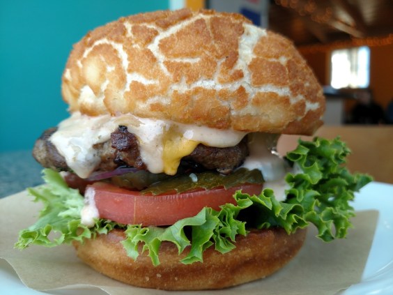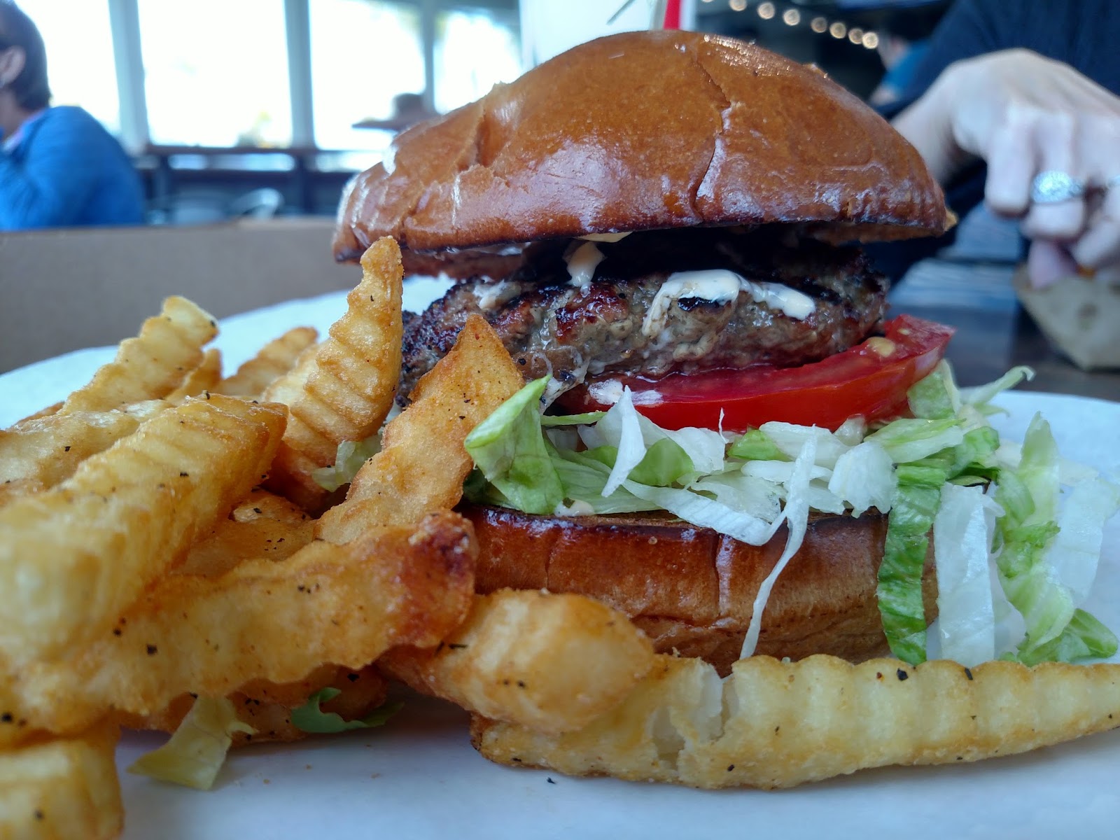 BEACH BURGER Morro Bay — This little place definitely blew me away on several levels. First of all, in the iconic bay-front Hof-Brau and D’Stasio’s location. Once you settle in to the amazing view, everything falls wonderfully into place. I pried a bit into the methods of the kitchen and one astonishing fact after another flowed forth: Basically everything is from scratch. No, SERIOUSLY! They dry their own onions and herbs and grind them. They make their own pickles. It goes on and on. I lost count of everything they make by hand in the kitchen every day. More attention to detail of ingredient could hardly be imagined. And the burgers, OMG. Everything is technically a cheeseburger, as they mold grated cheddar INTO the actual patty–a patty they blend and make by hand every day. Burgers come on Dutch Crunch rolls–this is a strict NO SESAME bun establishment.