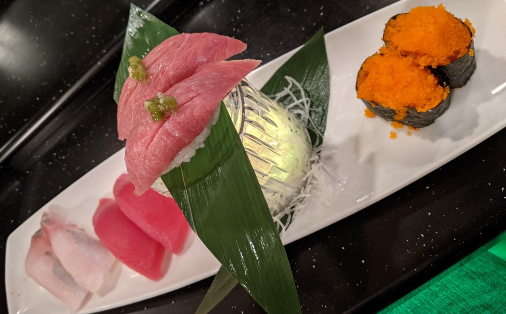 Anyway… Morro Bay is back to one sushi spot–one that I’m not COMPLETELY in love with, but honestly don’t have any complaints serious enough to even justify THAT statement. I don’t hate UMI–it’s entirely serviceable–above average, even. Haven’t had a single thing bad or unpleasant or poor-flavored or anything. Then why aren’t you in love with it? I dunno… it’s not Harada? That’s a super-lame reason, McConnell. Then why do you hate it? I DON’T HATE IT!! Then why don’t you like it? I don’t dis-like it. I’ve been three times. If I disliked it, I would never have gone the third time. It’s perfectly good sushi. There’s nothing inherently WRONG with this sushi. The masago is perfect, the maguro a bit bland, Hamachi, toro and saba always wonderful. Couple of my vegetarian favorites don’t seem to be on the menu: inari and daikon-sprout, but I’ve run into that one many times, and they are typically available. Come to think of it, masago’s not on the menu either, but they make it without a blink. Had a beautiful spider roll last visit–they call it something else. Service is still has some rough spots, but minor things…