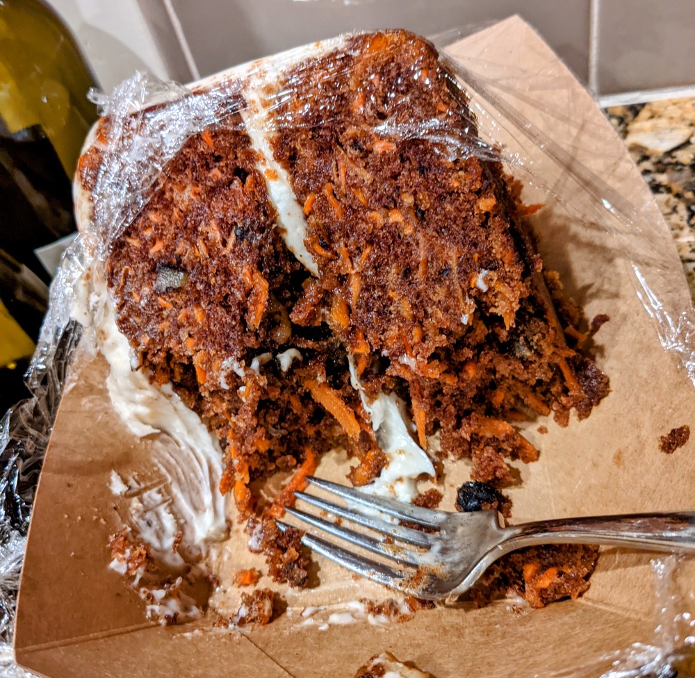 Time to settle the rabid TACO TEMPLE vs. FLAVOR FACTORY carrot cake controversy. So what do I do–since I’m merely a humble servant??? GO BUY THEM BOTH. Frostings nearly identical: FF’s maybe a *bit* sour-er–which I like. But the cakes themselves parted ways significantly. Long strings of visible vegetable woven throughout the TT version, managing a superb fluffiness despite the requisite density of these things. Perfect integration and texture, not too *spice-cake-ey* but allowing the carrot cake to be carrot cake. The hamburger joint’s was a disappointing mess. Gooey and sticky, dense and soggy and *flour-ey*, feeling under-cooked in its graininess, beautiful frosting could not salvage it and the entire team voted it down the drain.
