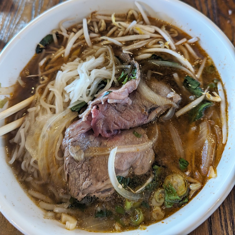 Speaking of pho… walked in to the new Thai place next to Firestone on Higuera to see if they had any noodle soup to fill a pho-craving. Thai places often have beautiful noodle soups which–though not bone-broth and spiced differently and I feel the noodles themselves are wheat–can fill a warm spot in your tummy. THAI DELIGHT does indeed have several noodle soups on the menu, but scroll down and there’s PHO!!! And it only comes in one version: THE PROPER VERSION: rare beef. And what beautiful beef it was, clearly still pink and really quality stuff, full of all those tangy raw beef notes. Broth is dark and roily, spiced hard and delicious. After losing Mandarin Gourmet and Lotus the past couple years, it’s nice to see the pho-quotient for SLO rise to TWO.